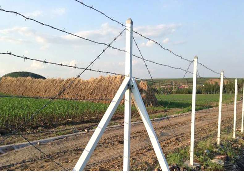 防爬刺絲剌網(wǎng)和立柱搭配使用效果好,每道刺絲刺網(wǎng)之間的間距一般為15- 25公分,高度1.8米,需要9道。農(nóng)場畜牧業(yè)常用的是這種,中間的立柱我們采用方鋼或者是圓鋼使用。支撐立柱焊接固定鉤子,把防扒刺絲剌網(wǎng)固定上面,把勾子拍下去即可。這是常用做法。