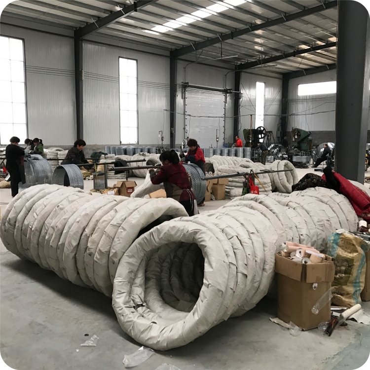 針對刺絲滾籠和雙股刺繩對于上鋅量是明顯的要求了,此外包括一些安裝長度和直徑等等方面要求也是比較多的。張開后形成蛇腹網狀,閉合后刀片刺繩圈徑為50cm,張開后每交叉圈安裝間距20cm,直徑不小于45cm,刀刺寬度22mm,兩刃垂直間距15cm,刀刺縱向間距34mm,芯絲直徑為2.5mm,刀片采用厚度0.5mm的Q195鋼板沖切制作,芯絲由HPB300直徑6.5m高線鋼絲冷拔加工。這樣名列出嚴格的技術要求也是為了保障安全和使用壽命。這里面我們要指出的一點就是小型的支架是為加密而設計的,而最大的刺繩支架是在階梯交接的地方進行安裝和固定的。安裝工序是肯定是先固定支架了,一般都有專門的u型螺栓抱咂在水泥制的圍欄上面只需要固定.