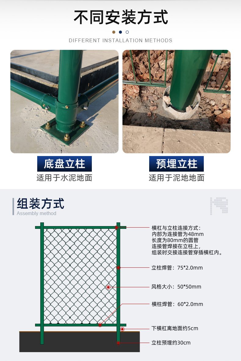 球場(chǎng)護(hù)欄網(wǎng)圍欄表面處理方式:圍網(wǎng)采用PE/PVC包塑,立柱、橫管采用噴塑、浸塑處理。