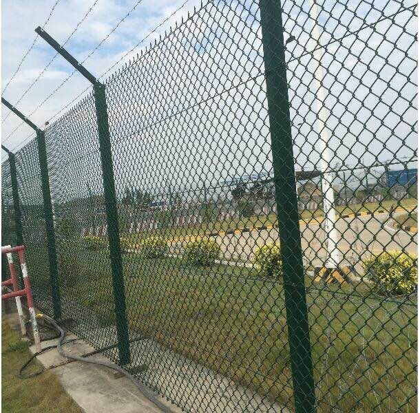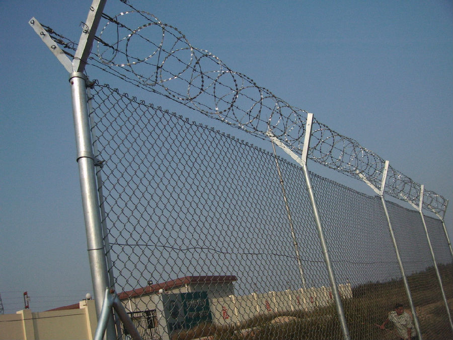 防護區周界柵欄主要由立柱、支撐、編織網、曲臂、刺絲、刺刀籠、系緊裝置及固定裝置等構件組成。
