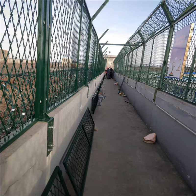 監獄防爬鋼網墻@浸塑監獄隔離網 @獄墻鋼網墻網是由普通鐵絲網鏈接立柱和刀片刺網連接組成的,網片連接方式采用sbs緊扣件,立柱又分為Y型立柱和普通立柱,一般情況下是把刀片刺網連接在網身頂端,在立柱上加兩道鋼絲網,用來固定刀刺網。也有將刀刺網連接在網身側端,將刀刺網穿插在網孔之中。