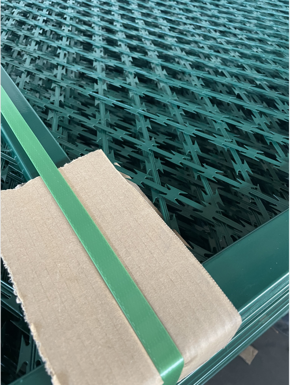 四,接下來(lái)就要焊接隔離網(wǎng)了。將焊接好的刀刺網(wǎng)按照施工圖紙對(duì)網(wǎng)面進(jìn)行進(jìn)一步處理,焊接好邊框和立柱后就可以進(jìn)行表面處理了。