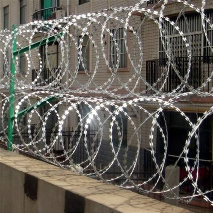 刀片刺網又名刮刀型刺絲,是一種近年發展起來的防護、隔離能力較強的新型防護網產品。鋒利的刀型刺由雙線扣裝后成蛇腹狀,既美觀又讓人不寒而栗。起到了很好的阻嚇作用。同時該產品具有美觀、防阻效果好、施工便利等優點。