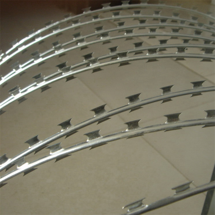 它采用鋼板(刀板)沖壓成型包附于熱鍍鋅鋼絲(芯線)之上,由銳利尖角鍍鋅鋼板或不銹鋼薄板做刀片,高張力鋼絲做芯線組合而成的。